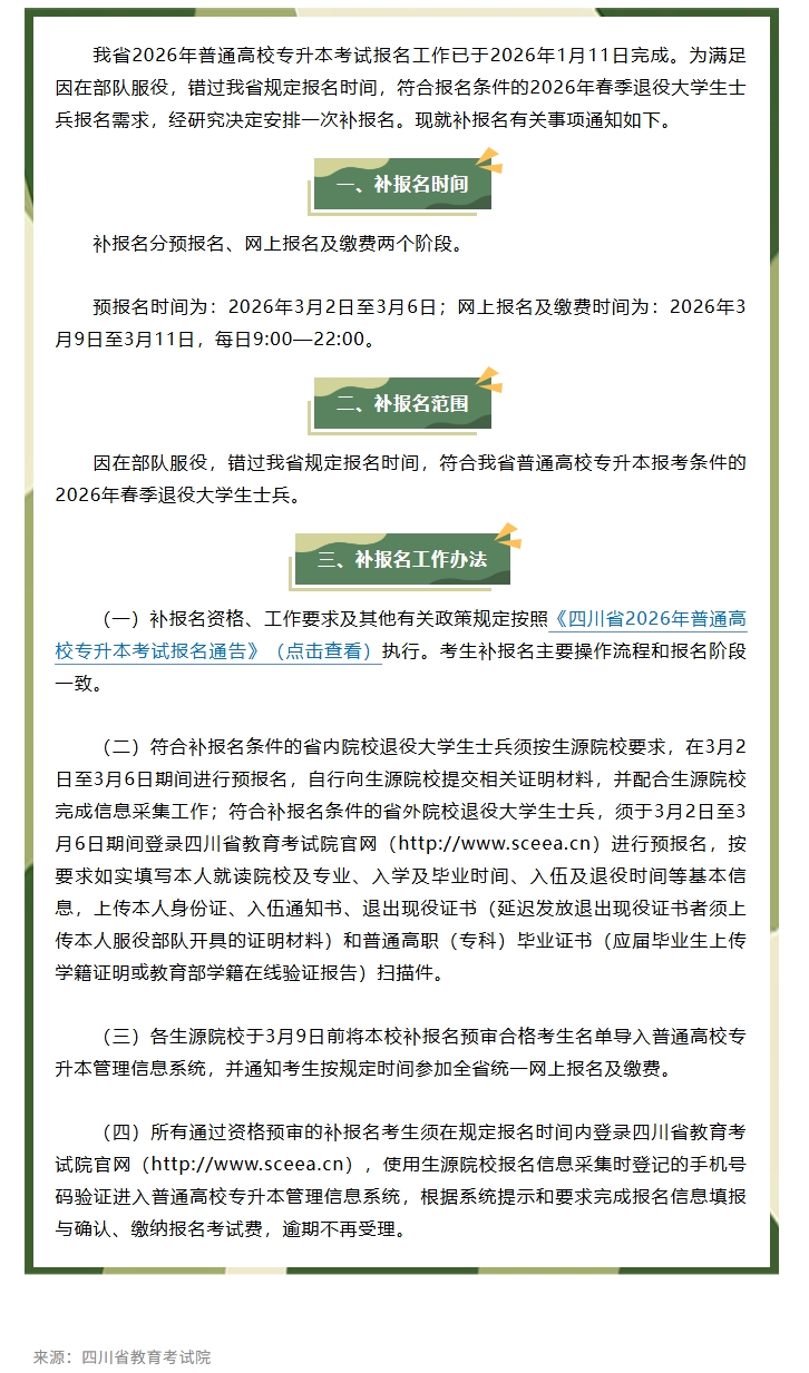 明天截止!四川省2026年普通高校专升本考试退役大学生士兵补报名通知