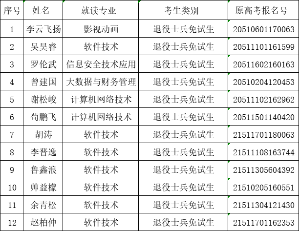 根据四川省考试院《关于做好我省2026年普通高校专升本考试报名工作的通知 》要求,现将我校2026年专升本退役士兵免试考生名单进行公示,公示期间,有任何异议,请于2026年1月9日17:00前实名向招生办公室反映。 联系方式:招生办公室(A1)杜老师,电话:028-64888003。